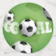 Soccer balls (footballs) in motion on a green background with white lettering "GOAL".