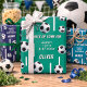 Soccer Ball Football Sports Kids Birthday Wrapping Paper Sheets. The design has a fun text "Kick up some fun" and soccer balls on a blue and green background. Personalise with your age and name.