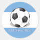 A soccer ball on light blue and white background. Custom stickers. Edit name to customise.