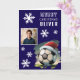 Score big this holiday season with our festive and personalized Soccer Ball Santa Hat Christmas Card! This delightful card features a classic black and white soccer ball adorned with a cheerful Santa hat, set against a blue background with falling snowflakes. A special photo frame allows you to easily add your child's picture, making it a truly unique keepsake. Customize the 'MERRY CHRISTMAS OLIVER' text to include any name, celebrating your little football fanatic. Perfect for sending holiday greetings to family and friends, this card is sure to bring smiles and show off their love for the game during Christmas.