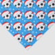 This Christmas wrapping paper features soccer balls wearing Santa's hat with snowflakes twirling around on a Christmas blue background.