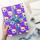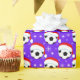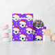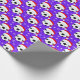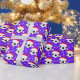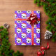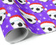 This Christmas wrapping paper features soccer balls wearing Santa's hat with snowflakes twirling around on a Christmas purple background.