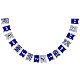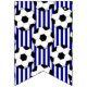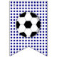 A fun garland banner with a repeating sequence pattern starting with a white striped background on which small black and white soccer balls appear; next a solid navy blue background on which a white template with the birthday boys age appears and lastly a white on navy blue check background on which a single vector football appears.