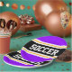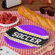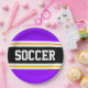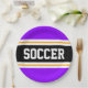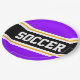 This sporty, athletic design features bold SOCCER text inside a highlighted wide centre black stripe with white and yellow pinstripes against bright purple outer stripes. The text can be personalised.