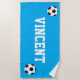 Blue custom beach towel for kids with white text perfect for the beach or swimming pool