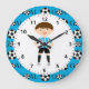 Soccer stars will love this great soccer design, with a young soccer player dressed in light blue and white stripes holding a soccer ball. The border of the clock is surrounded with soccer balls and the word, "goal" in a repeating pattern on a coordinated blue background. Contact us through the CelebrationBazaar store if you would like any variations to this design, including colour changes, and we would be happy to help.