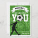 Sports themed classroom valentines day card featuring a green grass football pitch background, your valentines name, a silhouette of a soccer player, the cute saying "I get a kick out of you" with a football as the letter O, and the name of who its from.