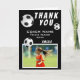 Soccer Football Ball Black Sports Thank you Coach Card. Soccer thank you coach card with photo, thank you text, coach name, team name, year, your name and soccer balls. Photo thank you card - add your photo to the template. Personalise the card with names and your text.