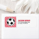 Send your soccer party invitation along with our soccer return address label. Design features a soccer ball on red stripes background. Colour theme is customisable, click ‘customise’ and change the background colour to your favourite soccer team colour. This football soccer return address label is perfect for your soccer birthday party, sport party, soccer themed baby shower or your little boy’s sport themed name and address labels.