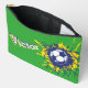 Bright yellow and dark blue football / soccer ball splatting in the back of the goal / net kids pencil case or accessory pouch. Ideal for football or soccer fans, personalise with your own name and choice of background colour currently green. Name on the case reads VIctor or change it to your own. Other matching items are available. Designed by Sarah Trett. www.sarahtrett.com for www.mylittleeden.com