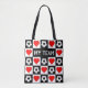 A super cute and customisable women's tote bag for soccer players, coaches and fans, featuring a unique black and white chequered design with bright red hearts on the white squares and soccer balls on the black squares, and a custom text box where you can type in your own soccer team name or any other text (school name, mascot, slogan, etc.)! These are perfect for soccer players, soccer moms, coaches and other fans to carry during soccer season, especially to soccer games and tournaments!