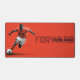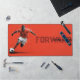 A skilled soccer player in a red jersey is captured in mid-action, dribbling a soccer ball against a vibrant red background. This illustration showcases the energy and excitement of the sport. You can customize both texts in this design. This is a great desk mat for soccer fans.