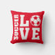 Red SOCCER LOVE Soccer players cushion. Soccer players will love this comfy Soccer cushion! This Soccer cushion has a Love theme with the words SOCCER and LOVE in bold white letters. A soccer ball serves for the letter O giving this design a real soccer theme. On the back of this cushion is the same Soccer Love design but printed as a fantastic all over patterned print. This comfy cushion looks great on any chair and will show everyone you have a ardent love for Soccer. More fun soccer themed gifts and merchandise available in the STAND UP AND CHEER store!