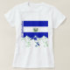 Three El Salvadoran soccer players in silhouette play in front of the El Salvadoran flag. Country name El Salvador is on the side.