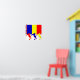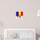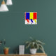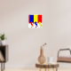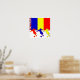 Three soccer players play in front of the Romanian flag. Country name Romania is on the side