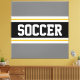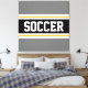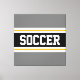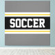 This colourful sporty design features bold SOCCER text inside a wide black horizontal centre stripe with white and golden yellow racing stripes against grey outer stripes. The text can be personalised.