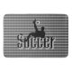 Pictured on top of the word Soccer a soccer player kicks the soccer ball