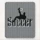 Pictured on top of the word Soccer a soccer player kicks the soccer ball