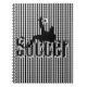 Pictured on top of the word Soccer a soccer player kicks the soccer ball