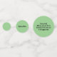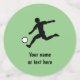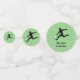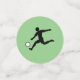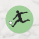 The footballer in this graphic is kicking a soccer ball, ready to strike and win the match. This light green confetti creates a fun effect with the striker on the front of each and some optional text (delete the placeholder text to keep plain) on the back of the large circle, and an optional date on the medium one. The small circle has been left empty on the back for contrast.