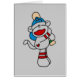 Sock monkey baseball player design featuring a grey and red sock monkey with a blue baseball cap up at bat on baseball T-shirts, mugs, hoodies, bodysuits, cards, stickers, tote bags, and other items.