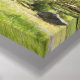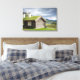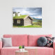 Canvas landscape print of a sod roof log cabin with grass on top with a great view over a green valley and a Norwegian flag in Jotunheimen national park in Norway.