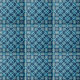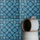 This ceramic tile features an intricate, symmetrical pattern that radiates from the centre, creating a kaleidoscopic effect. The design is complex and meticulously crafted, with shapes that intertwine and overlap, adding a sense of depth and dimension. The colour palette is dominated by various shades of tranquil soft blues and darker indigo hues, which interplay beautifully, evoking the serenity of the ocean depths. The precision of the pattern and the complexity of the design give it a contemporary flair, while its symmetry and the use of colour are reminiscent of traditional mosaic artwork.