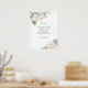 Elegant botanical themed Bridal Shower welcome sign with a decoration of soft blue and pink flowers and elegant green foliage at the corners.