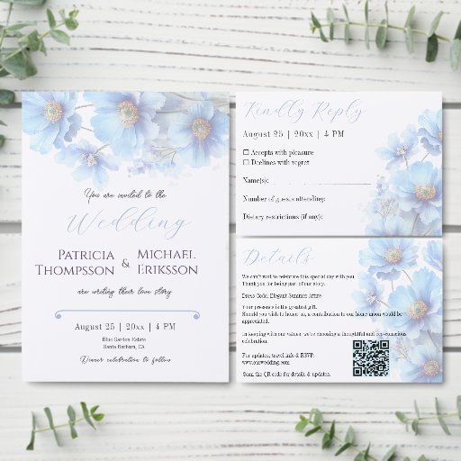 This elegant floral wedding design combines airy blue watercolor florals with a minimalist, editorial layout, creating a calm and sophisticated aesthetic. Designed for couples who appreciate subtle luxury and botanical beauty, it is ideal for garden weddings, estate celebrations, coastal ceremonies, and outdoor venues.