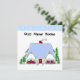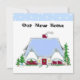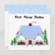 A great 'new home' or housewarming party invitation. Customise with all of your information as desired. A cute blue roofed house with a red door and red accents. Soft snow covers the roof line and trees.