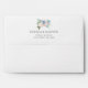 A watercolor bouquet of white and ivory roses, pink and blue flowers with delicate leaves is displayed over the return address and white colour decorates the inside of this elegant white envelopes adding a chic botanical twits.