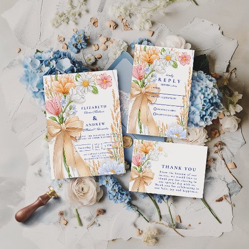 A soft and romantic floral design featuring peach and blue wildflowers tied with a powder-blue ribbon. The airy composition and hand-drawn feel make it perfect for spring or summer weddings, bridal showers, or garden-themed celebrations. A timeless blend of rustic charm and elegant simplicity.