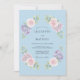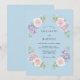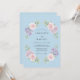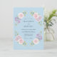 A soft blue background provides a serene backdrop for delicate watercolor floral arrangements. Lush clusters of blush pink roses and purple hydrangeas are accented by soft green foliage. The design evokes a romantic and airy springtime atmosphere perfect for an elegant outdoor event. Each element is painted with a subtle watercolor texture that adds a touch of artistic grace.