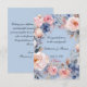 Against a serene periwinkle background, a lush frame of watercolor blossoms encircles your message. Delicate blush and powder pink peonies complement dusty blue poppies and soft sage foliage, creating an elegant, garden-inspired design. The script on the front, along with the names and date, is fully customisable, allowing you to tailor this beautiful card for any happy couple.