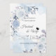 This design features a delicate arrangement of soft blue, white, and lavender roses and botanical elements, framing a clean center area for your event details. The background has a dusty blue watercolor wash, lending a romantic, ethereal, and elegant feel.