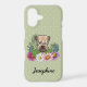 Destei's original cartoon illustration of a cute Soft-coated Wheaten Terrier breed dog's head close-up surrounded by colourful summer wildflowers. There is a blush pink flower, a purple flower, a dark pink flower and a white daisy flower together with some green leaves and branches. The background colour is green with a light polka dot pattern. The background colour can be changed to any other colour and the polka dot pattern can be removed, if so wished. There is also a personalizable text area for a name.