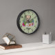 Destei's original cartoon illustration of a cute Soft-coated Wheaten Terrier breed dog's head close-up surrounded by colourful summer wildflowers. There is a blush pink flower, a purple flower, a dark pink flower and a white daisy flower together with some green leaves and branches. The background colour is green with a light polka dot pattern. The background colour can be changed to any other colour and the polka dot pattern can be removed, if so wished. The hours are marked with numbers. The hours and minutes are shown with a dotted clock face. There is also a personalizable text area for a name or other custom text in a lovely script font.