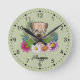 Destei's original cartoon illustration of a cute Soft-coated Wheaten Terrier breed dog's head close-up surrounded by colourful summer wildflowers. There is a blush pink flower, a purple flower, a dark pink flower and a white daisy flower together with some green leaves and branches. The background colour is green with a light polka dot pattern. The background colour can be changed to any other colour and the polka dot pattern can be removed, if so wished. The hours are marked with numbers. The hours and minutes are shown with a dotted clock face. There is also a personalizable text area for a name or other custom text in a lovely script font.