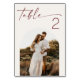 A minimalist wedding table number card designed to help guests easily find their table while adding a personal touch to your reception decor. Set on a soft ivory background with deep wine red (burgundy) typography, the design combines a script heading with a clean, modern layout. The card features space for a custom photo, creating a meaningful detail that reflects your story while keeping the overall look simple and refined. The balanced layout allows the photo and typography to work together without feeling crowded. This design works beautifully for modern, minimalist, and romantic wedding settings.