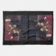 Soft kitty paws are the first thing you see in the original photograph of a calico cat on this Kitchen Towel. The mostly black and brown cat is lying on a dark red and brown blanket against a dark background, and her white paws stand out, spread out in front of her with the centre two crossed over each other. The white fur on her chest leads up to her face, with her eyes fixed on something across the room.