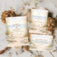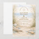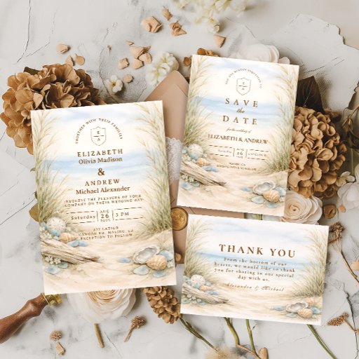 A refined coastal wedding design featuring an elegant oval wreath of seashells, oyster shells, starfish, and soft sea glass accents. Neutral sandy tones blend with muted ocean blues and delicate dune grasses to create a serene seaside aesthetic. The warm parchment background enhances the natural textures while maintaining a timeless, elevated feel. Perfect for a romantic beach celebration with classic coastal charm.