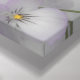 A square format still life of purple and white pansies in a white vase. Image has been desaturated with an added textured background.