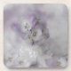 A square format still life of purple and white pansies in a white vase. Image has been desaturated with an added textured background.