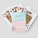 Playing cards featuring your name in a handwritten style script over a soft, pastel coloured sunrise with a cliffs and two birds on the front.