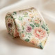 Beautiful necktie with soft peach and cream roses mixed with delicate green leaves on a light background. The pattern has a gentle, romantic vintage charm that feels fresh and elegant. It’s a lovely choice for weddings, garden parties, or any occasion where you want a subtle floral tie that looks refined and tasteful.