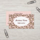A pretty, pastel pink leopard print decorates this professional business card. Customise this business card to suit your needs. Change the text, font size, etc...The design is from original art. Use this stylish business card for a bakery, consultant, boutique, fashion, clothing, alterations, decor, boutique, makeup artist, cosmetologist, candy, hair stylist, salon, spa, nail salon, home decor, interior design, musician, etc...