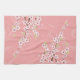Pretty and girly soft pink cherry blossom design features a branch from the pink flowering cherry or dogwood tree sakura. Baby pink background with light swirls, with a foreground of dark brown tree branches with petals and green leaves. A lovely design for baby shower, feminine events or occasions.
