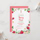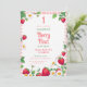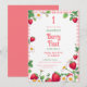 A sweet and playful design featuring a pink gingham border decorated with vibrant strawberries, delicate daisies, and lush green leaves. The cheerful farmhouse aesthetic and fresh fruit elements create a warm and inviting look, perfect for celebrating a baby girl's 1st birthday. The combination of floral and berry accents adds a whimsical and nostalgic charm.