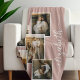 Crafted from soft, luxurious fleece, this blanket not only provides comfort but also serves as a beautiful keepsake that tells a story of family and friendship. The gentle soft pink hue adds a touch of elegance, complementing the vibrant photos within the collage. Each blanket can be customised with text, transforming it into a unique piece that reflects the special bonds you share. It's ideal for snuggling on the couch, adding a decorative touch to a bedroom, or keeping warm during family gatherings.