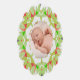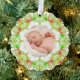 Soft Pretty Green Pastels Custom Christmas Photo Picture Ornament. Jolly and Festive Pastels Green and Juicy Orange Custom Christmas Photo Picture Frame Round Christmas Tree Decoration. A soft colourful circular bauble ornament for your pretty green and orange multicolour themed tree and decorations. The frame design is a merry geometrical abstraction pattern take on traditional colour block festive designs. In pastel colours of winter tree green and bright merry orange for a Winter Wonderland. Personalise it by replacing the two photos, on the front and back, with your own for an early gift for family and friends to celebrate Christmas. The stock photo shows a baby sleeping. Cherish your Yuletide memories. A great gift for best friends and brothers and sisters, or couples. A budget friendly keepsake gift, for family celebrations or first Christmases.
